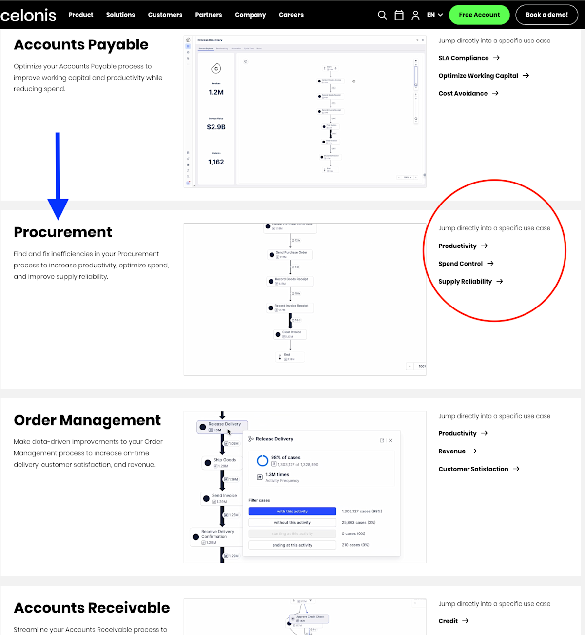 Here’s an example of a well-designed demo library from Celonis who has taken a similar approach of segmenting the demo library based on industry and use case. Buyers can explore the demos at their own pace, gaining a deeper understanding of the product and fast forwarding the informed decisions.