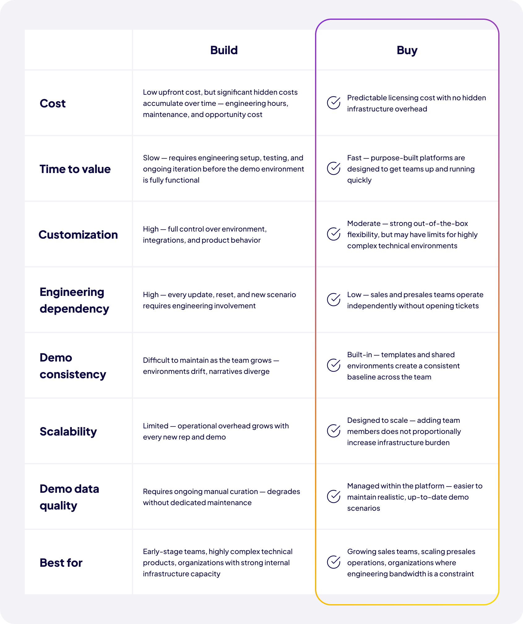 Similarly, for products with highly complex or specialized technical environments — those requiring deep internal integrations, custom infrastructure configurations, or tightly controlled data environments — a purpose-built demo tool may not offer the level of customization needed. In those cases, internal builds can be the more viable path, provided the engineering capacity to support them exists and is sustainable.