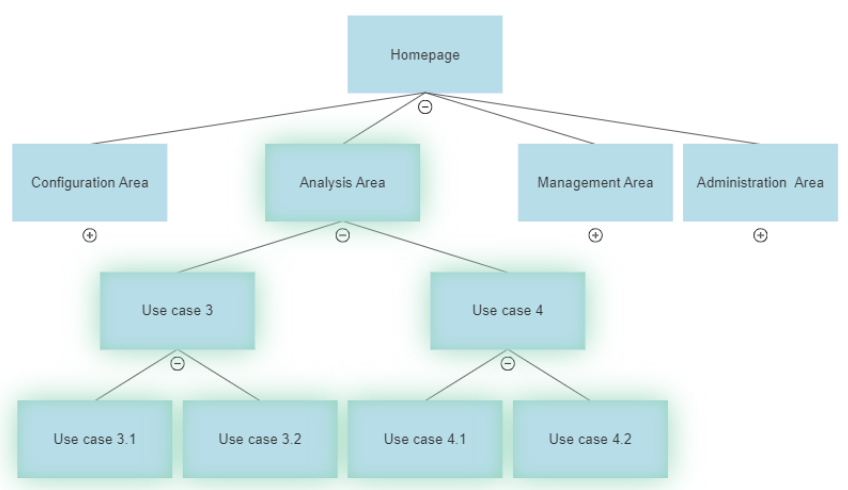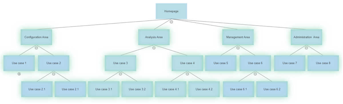 In the example below, we allow the user to navigate from the homepage to all (or multiple) areas in the solution. They can then drill down to any of the available use cases they wanted within any ‘open’ area of the solution.