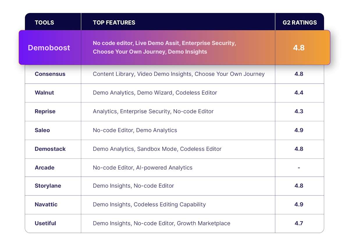 Fortunately, the emergence of product demo software addresses this challenge head-on. These innovative tools provide a solution for creating and delivering demos efficiently and effectively. We have reviewed and compared several providers in this space to help you navigate the options available. Here’s the snapshot of our curated tools review