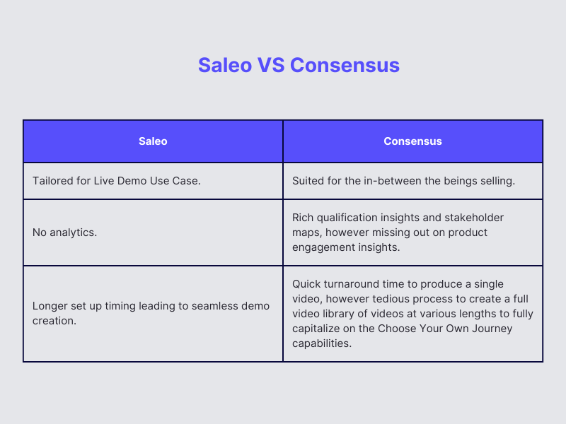 When it comes to analytics and insights, there is a clear difference between Saleo and Consensus. Saleo does not provide any explicit analytics features. Meanwhile, Consensus offers an innovative and interactive video demo platform that not only generates personalized demos on-demand but also helps to prioritize demo qualified leads (DQL). This further allows Consensus to automate a self-guided experience at scale, making it a valuable asset to sales teams.