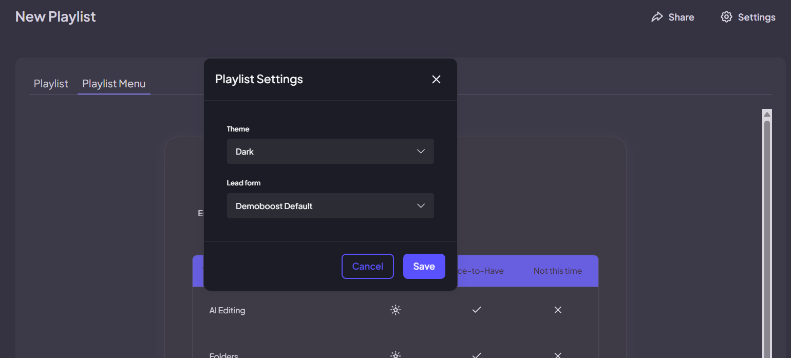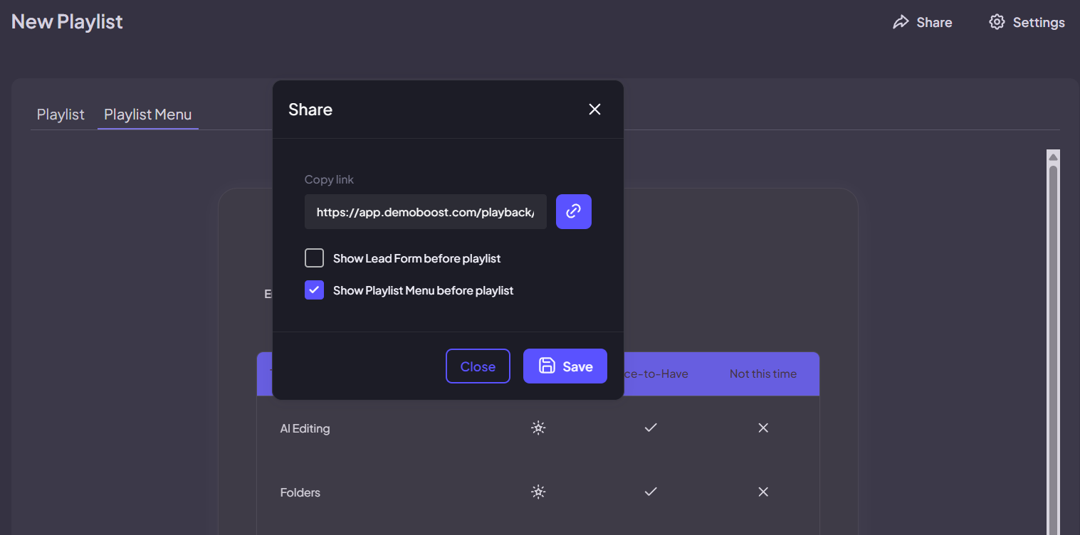 Click on the Playlist Menu tab. This is where you decide which chapters your viewers can prioritize. Enabling this turns your demo into a discovery tool that captures buyer intent.